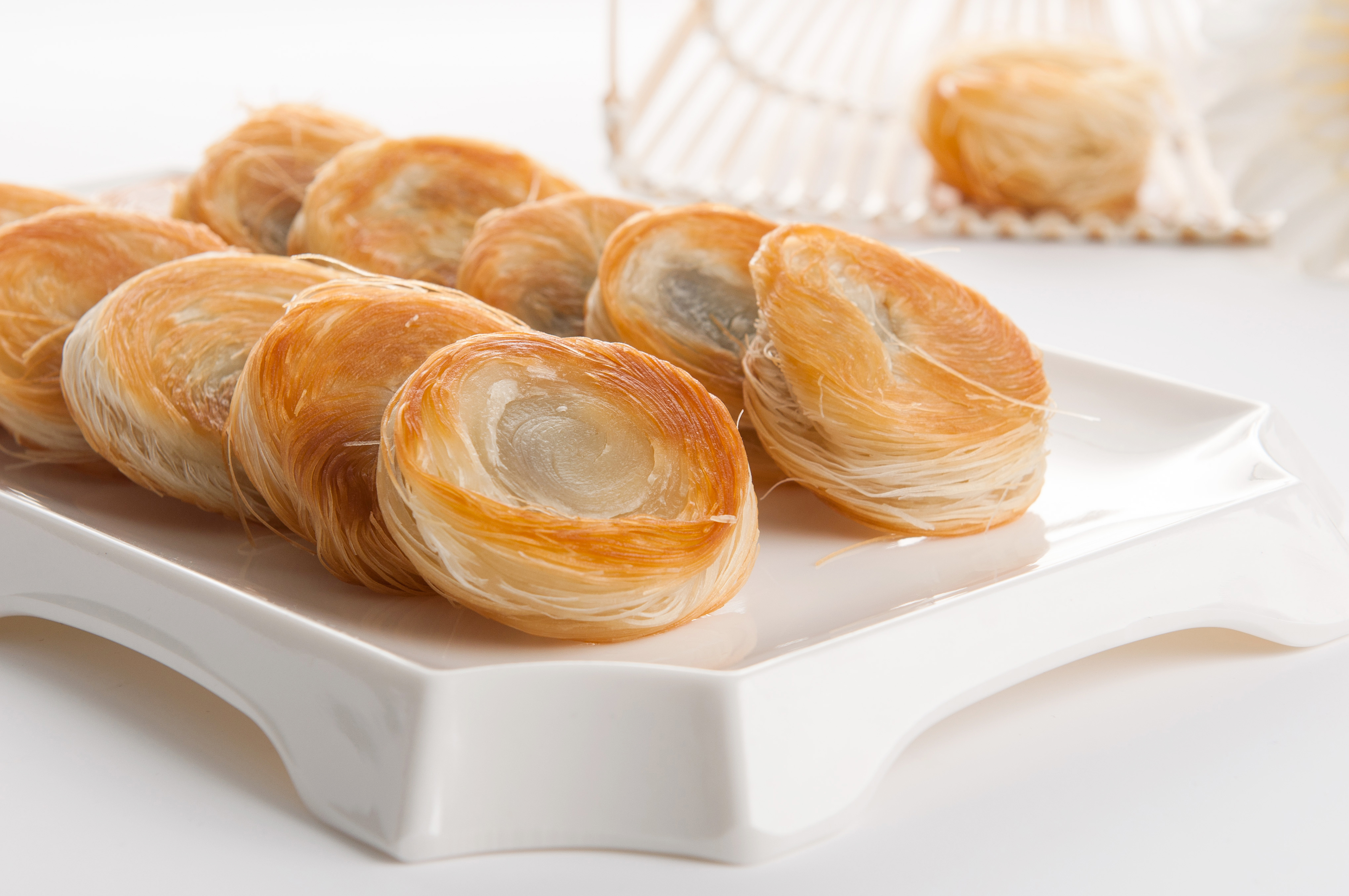 金丝饼:经典豆沙馅,千丝万缕,层层分明,口感层次饱满丰富